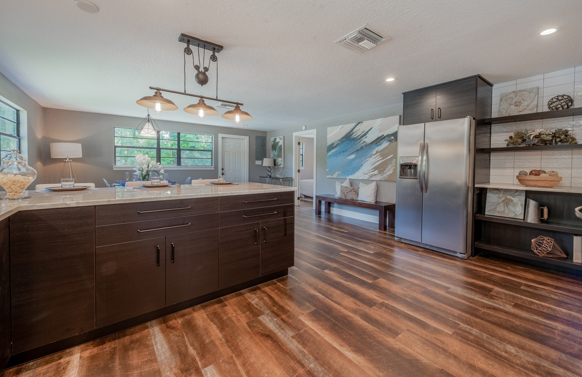Just blocks from Park Avenue, I knew that this build would have to have some extraordinary features to satisfy higher end prospects and to earn its higher end price tag. Entering the homes front door actually ushers you into a courtyard, with tall bamboo and a water feature set among smooth gray stone paths providing the backdrop for a zen entryway. Inside, carefully laid inlays in the floor match ceiling details overhead, while LED accents hidden in the tray ceilings bathe the room in soft light. The buyers were blown away at the level of detail!